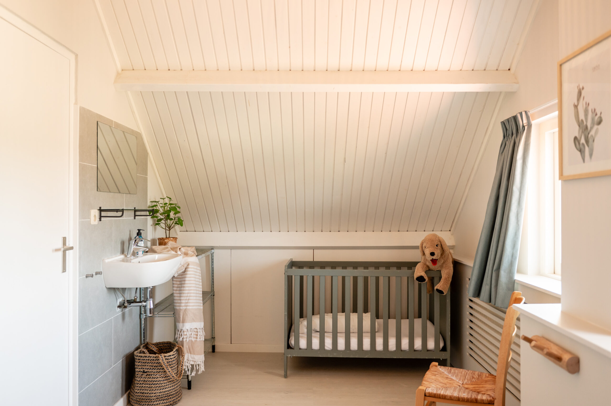 Es gibt ein Kinderbett und einen Hochstuhl im Haus.