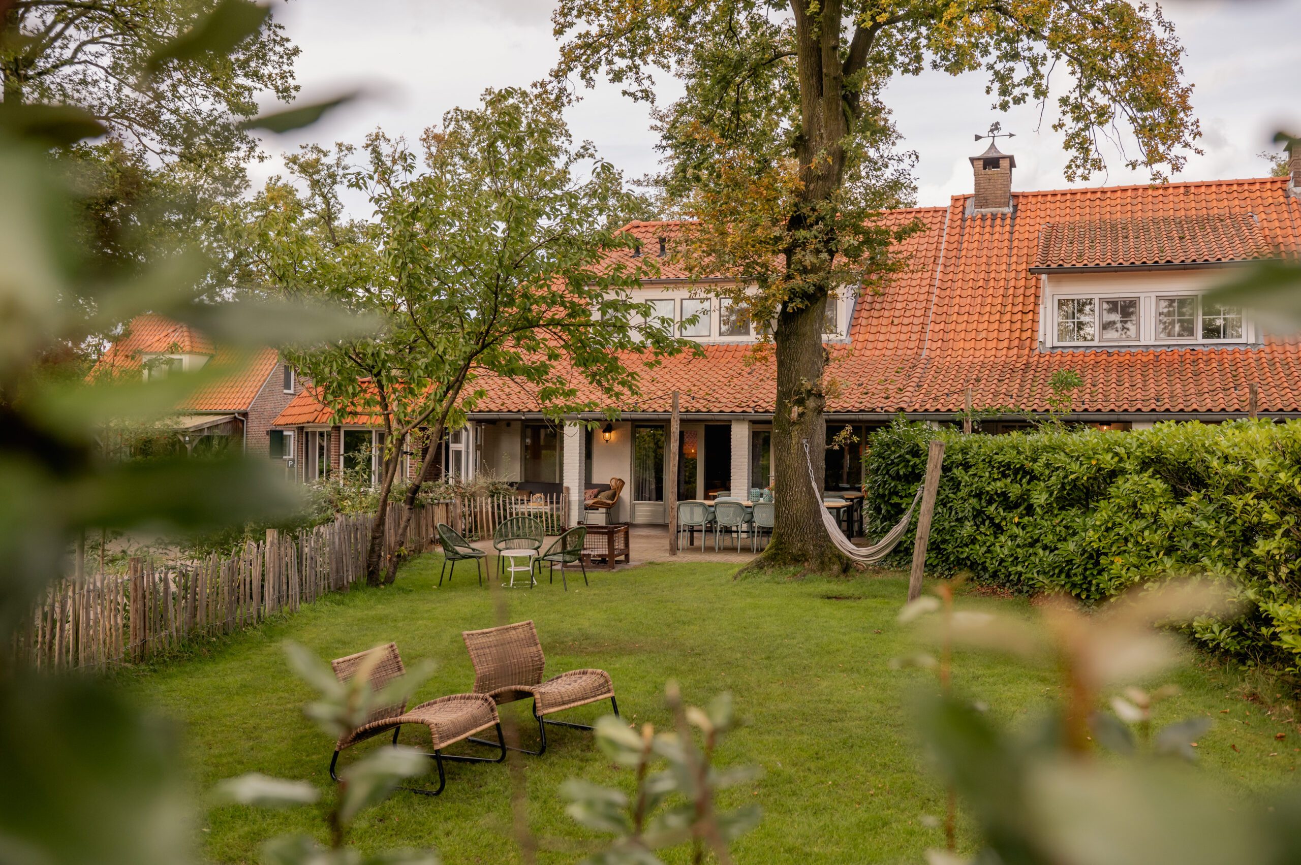 Attraktive und geräumige Gruppenunterkunft. Draußen mit gemütlicher Veranda, Terrasse, Grill, Gartenkamin, Tischtennisplatte und Hängematte.