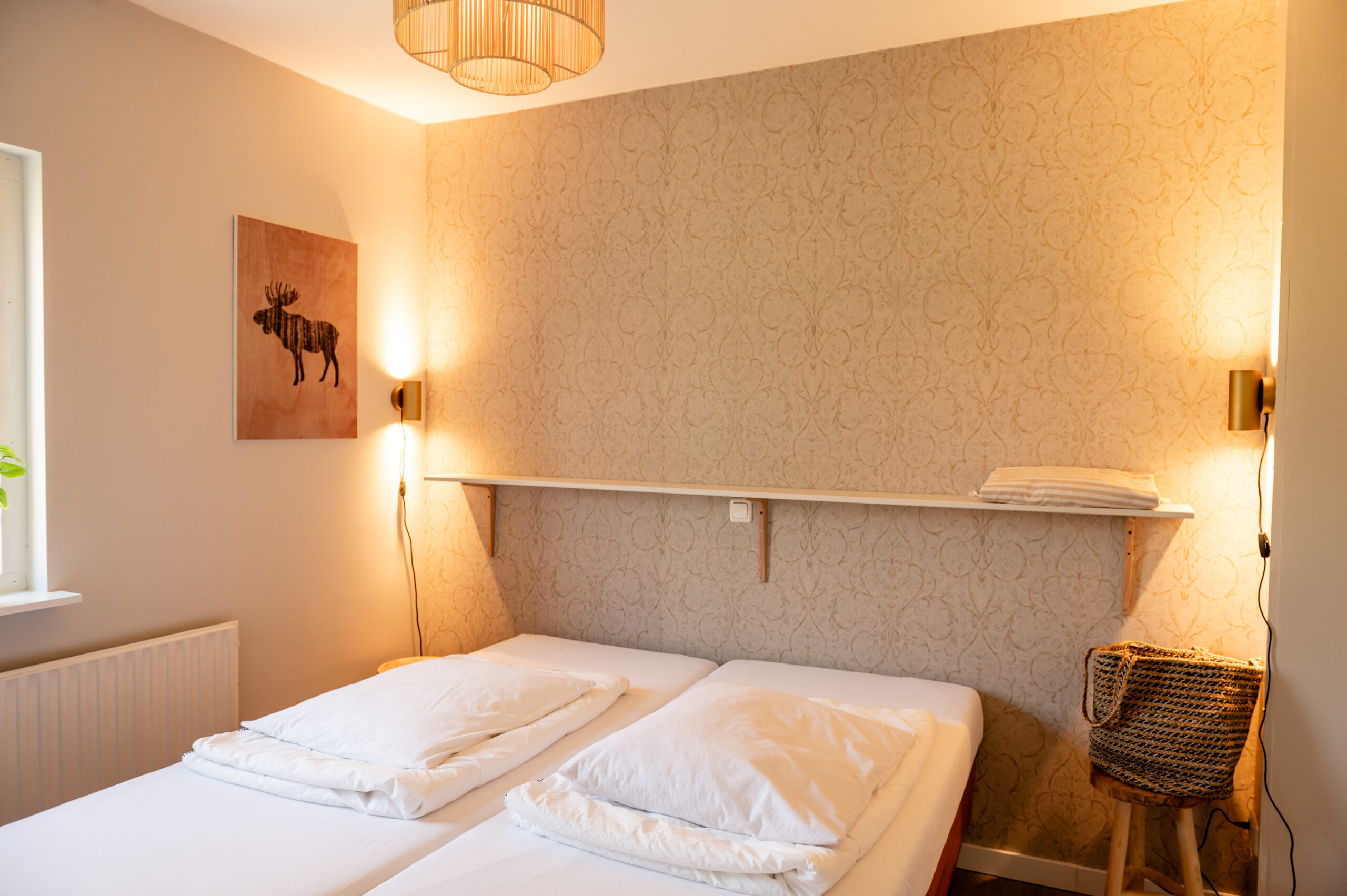 – 1 bedroom with 2 box-spring beds.