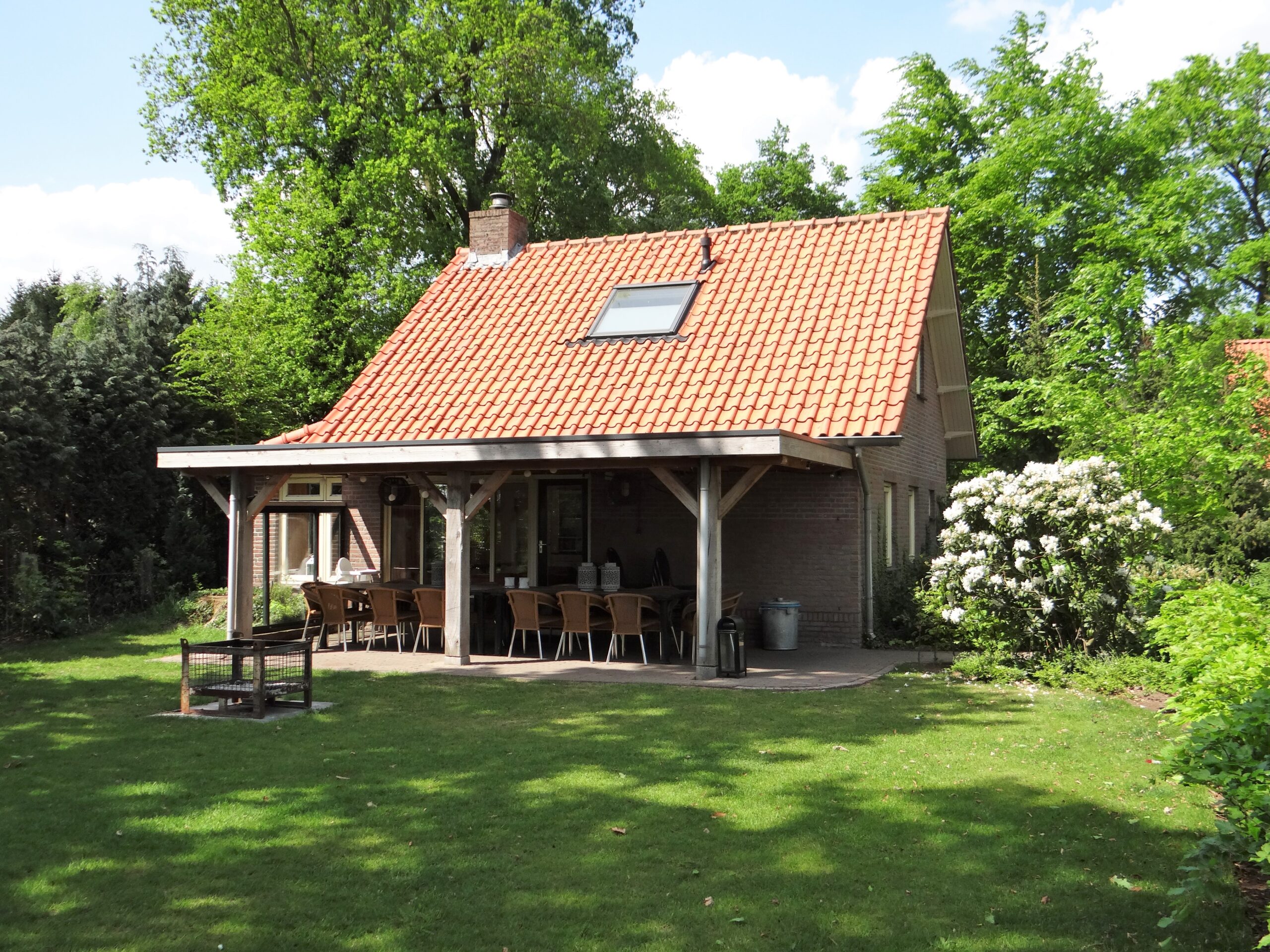 Vanaf de sfeervolle veranda van dit vakantiehuis heb je zicht op de vlindertuin met water-zand speelplaats voor de kleintjes!