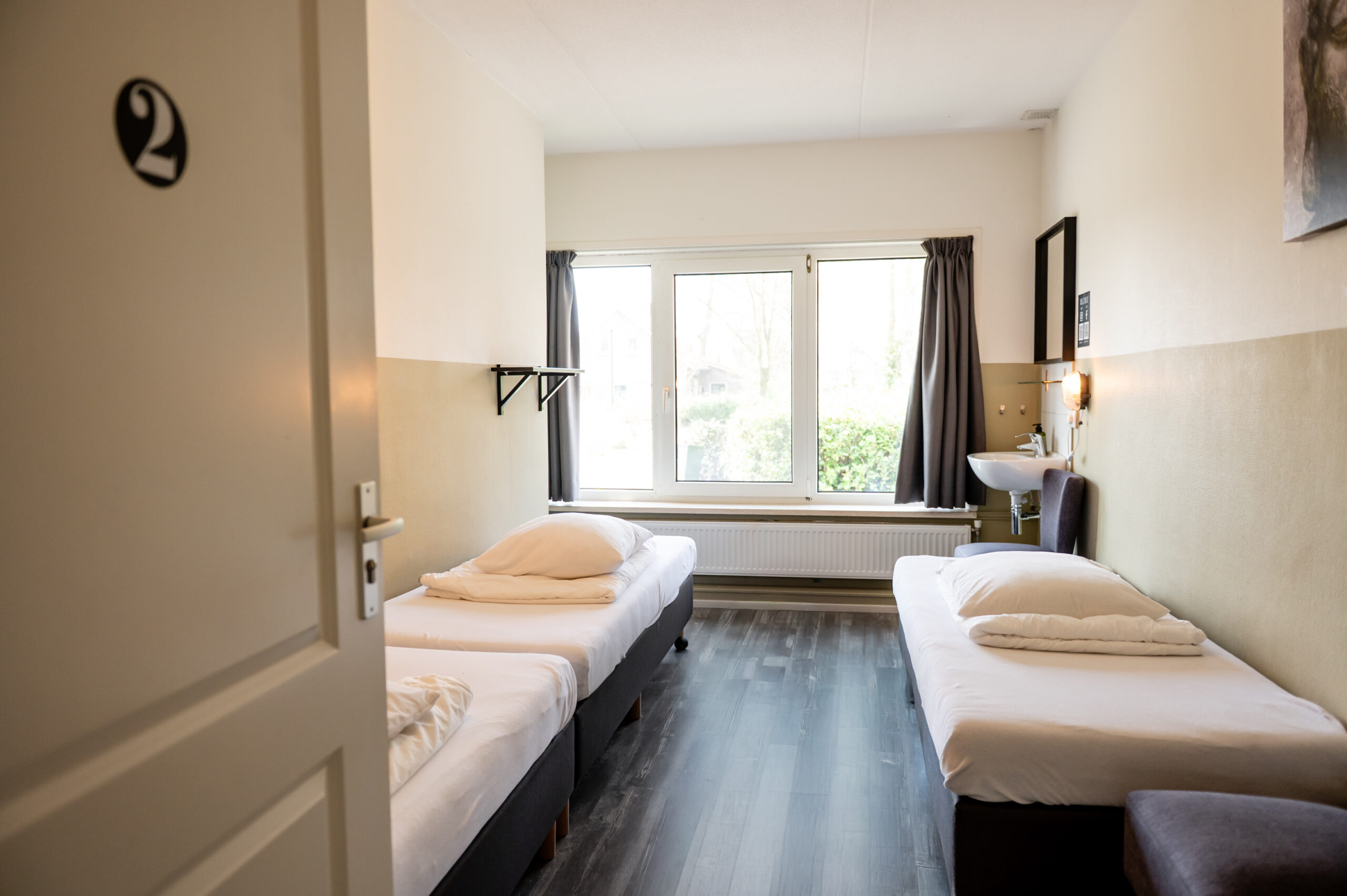 – twee slaapkamers met 3 eenpersoons bedden en een wastafel